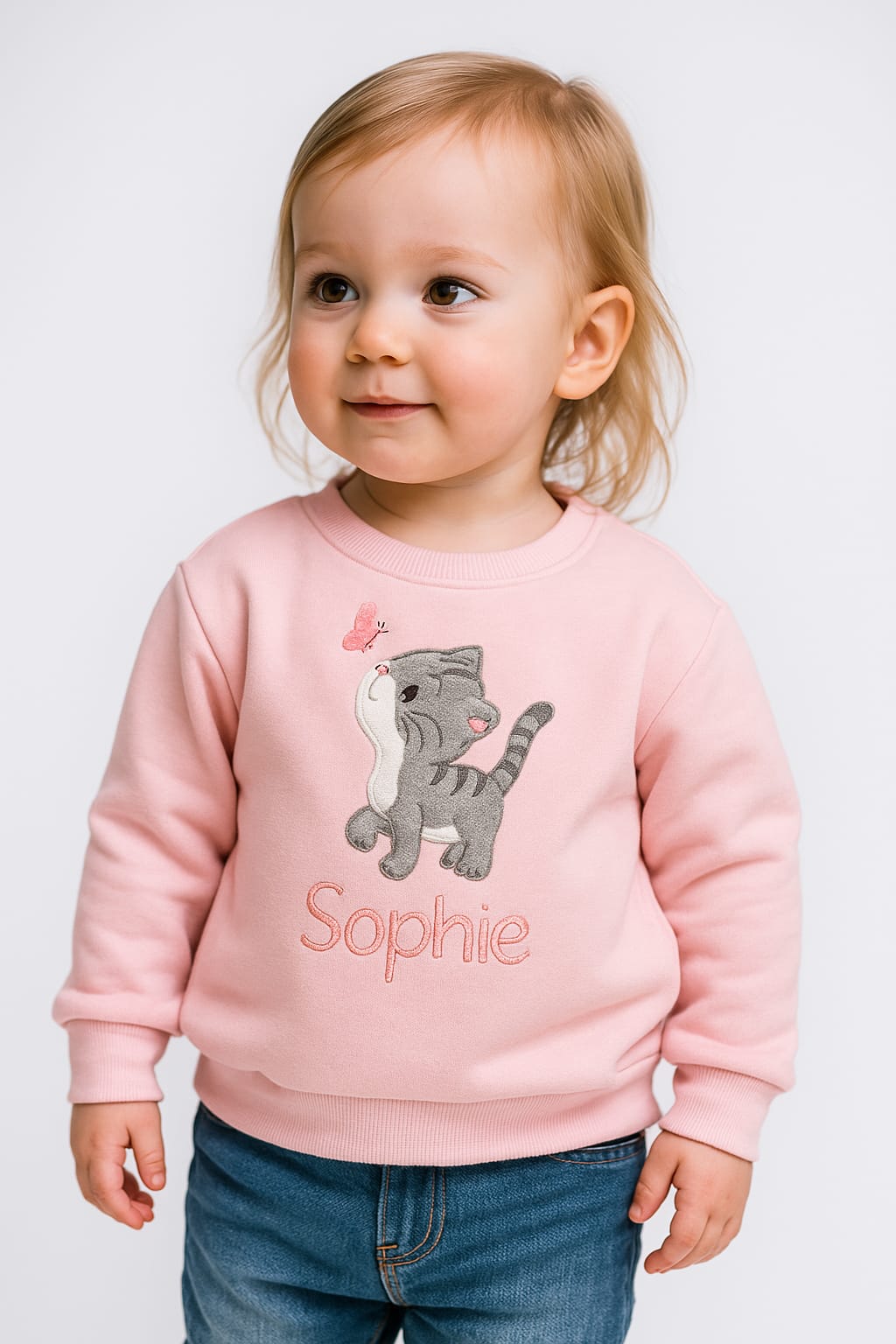 Angeboten wird ein mit Liebe handgemachtes Sweatshirt in rosa mit einer Katzenapplikation und dem Namen „Sophie“
