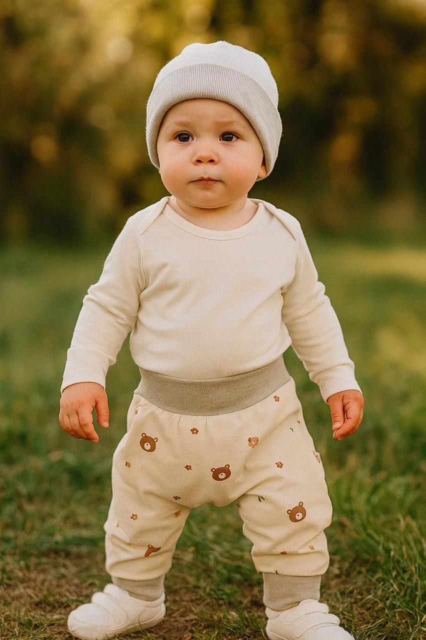 Bequeme Pumphose in Beige mit niedlichem Bärenmotiv. Handgemacht, mit weichen Bündchen für sicheren Halt und angenehmen Tragekomfort.