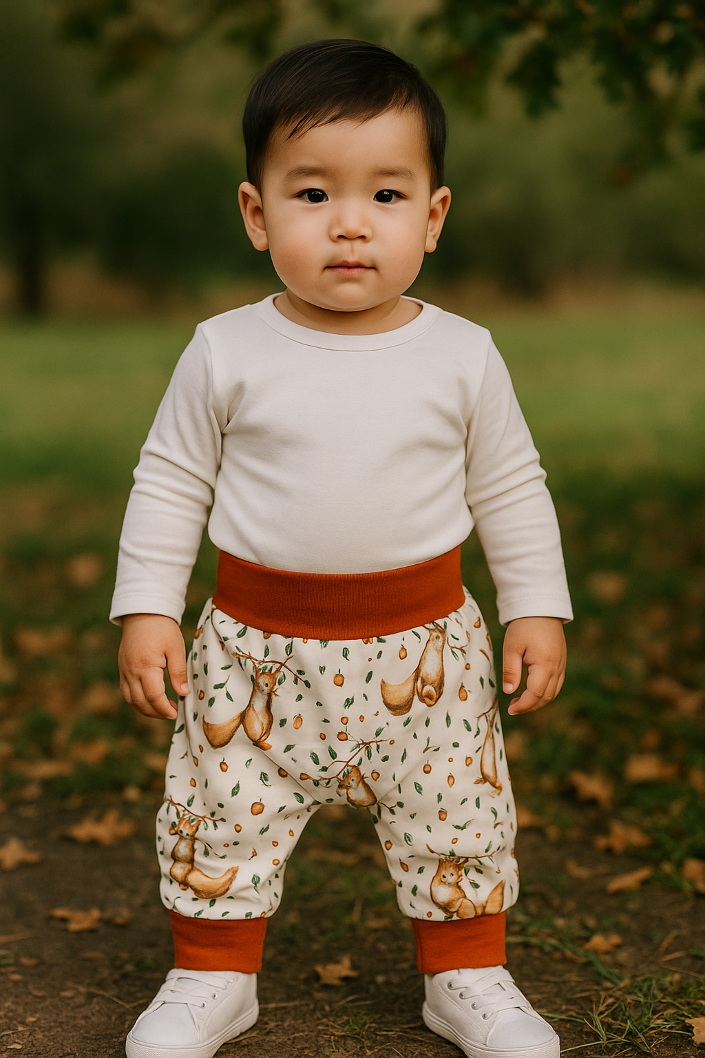 Diese bequeme Pumphose ist ein liebevoll handgefertigtes Einzelstück und verbindet Komfort mit einem besonderen Design. Der weiße Stoff mit niedlichem Eichhörnchenmuster macht die Hose zu einem echten Hingucker, während die braunen Bündchen am Bauch und an den Beinen für optimalen Halt sorgen.