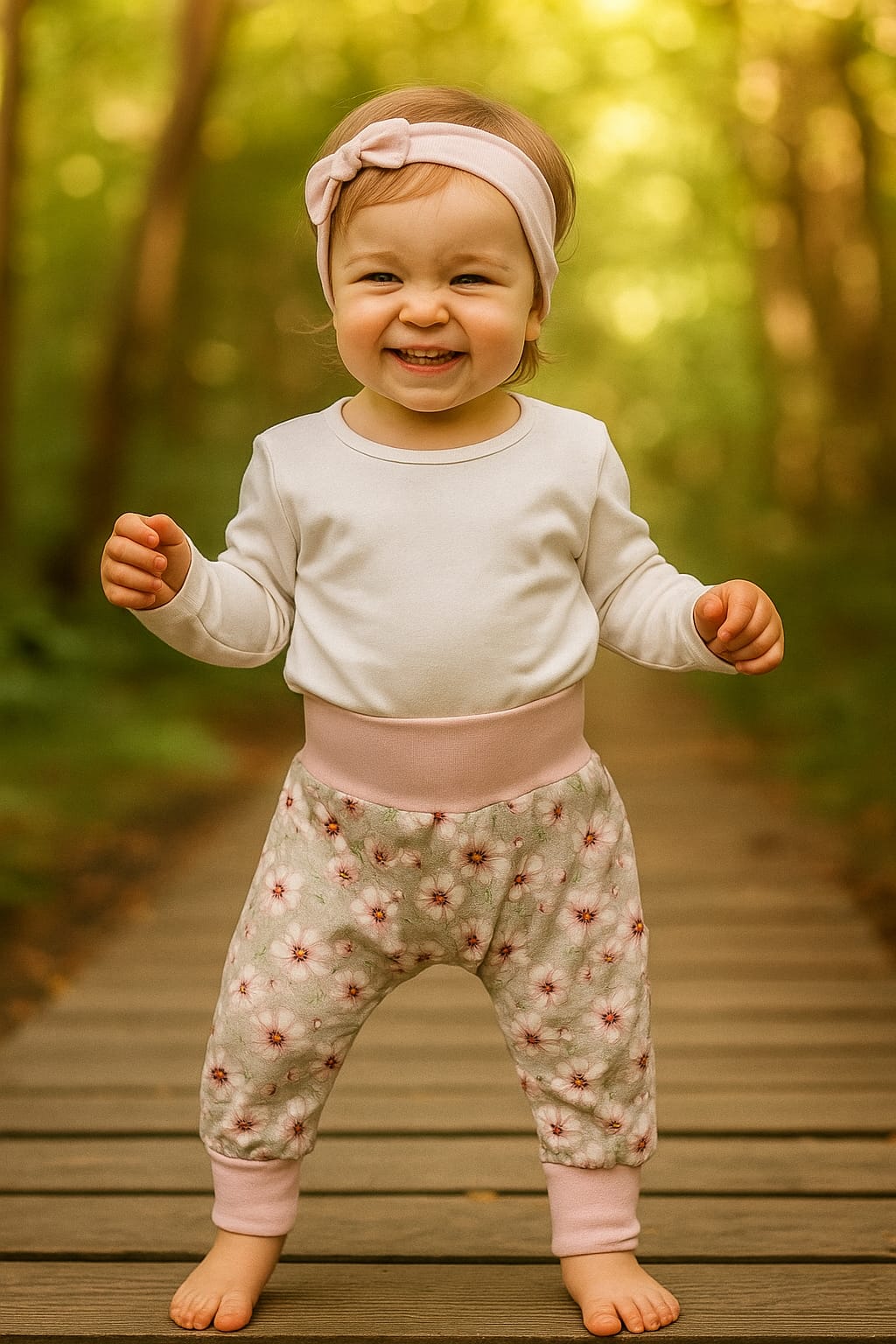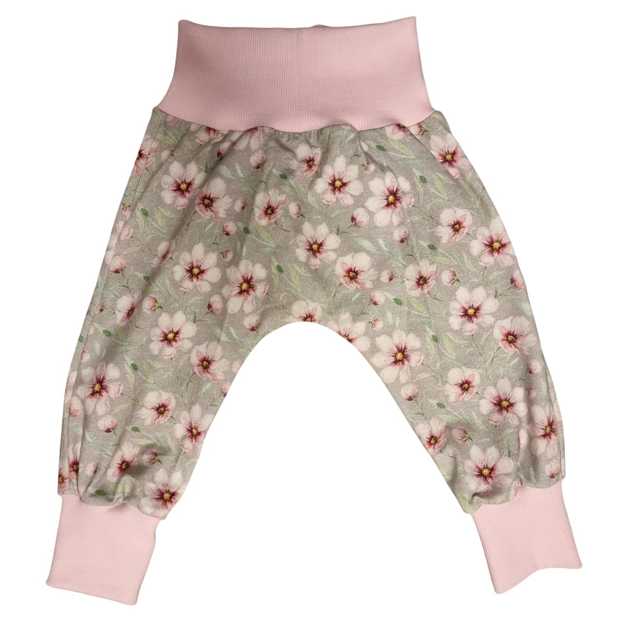 Bequeme Pumphose in hellem Grau mit süßem Kirschblütenmotiv. Handgemacht, mit rosa Bündchen – bequem, elastisch und perfekt für kleine Entdecker.