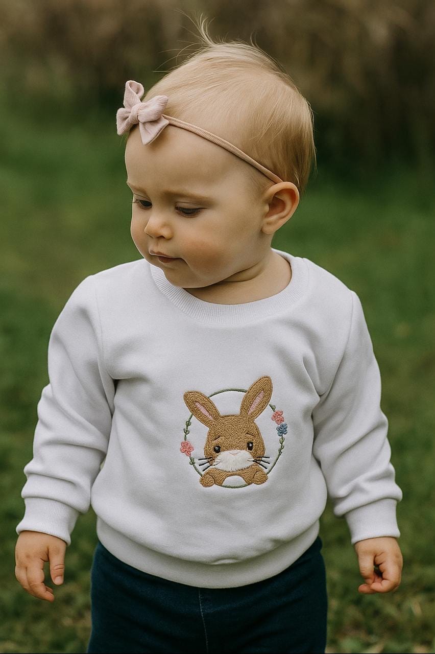 Dieses süße Sweatshirt ist ein echter Hingucker für kleine Mädchen. Mit seiner liebevollen Hasenstickerei auf weißem Stoff bringt es Verspieltheit und Charme in jedes Outfit.