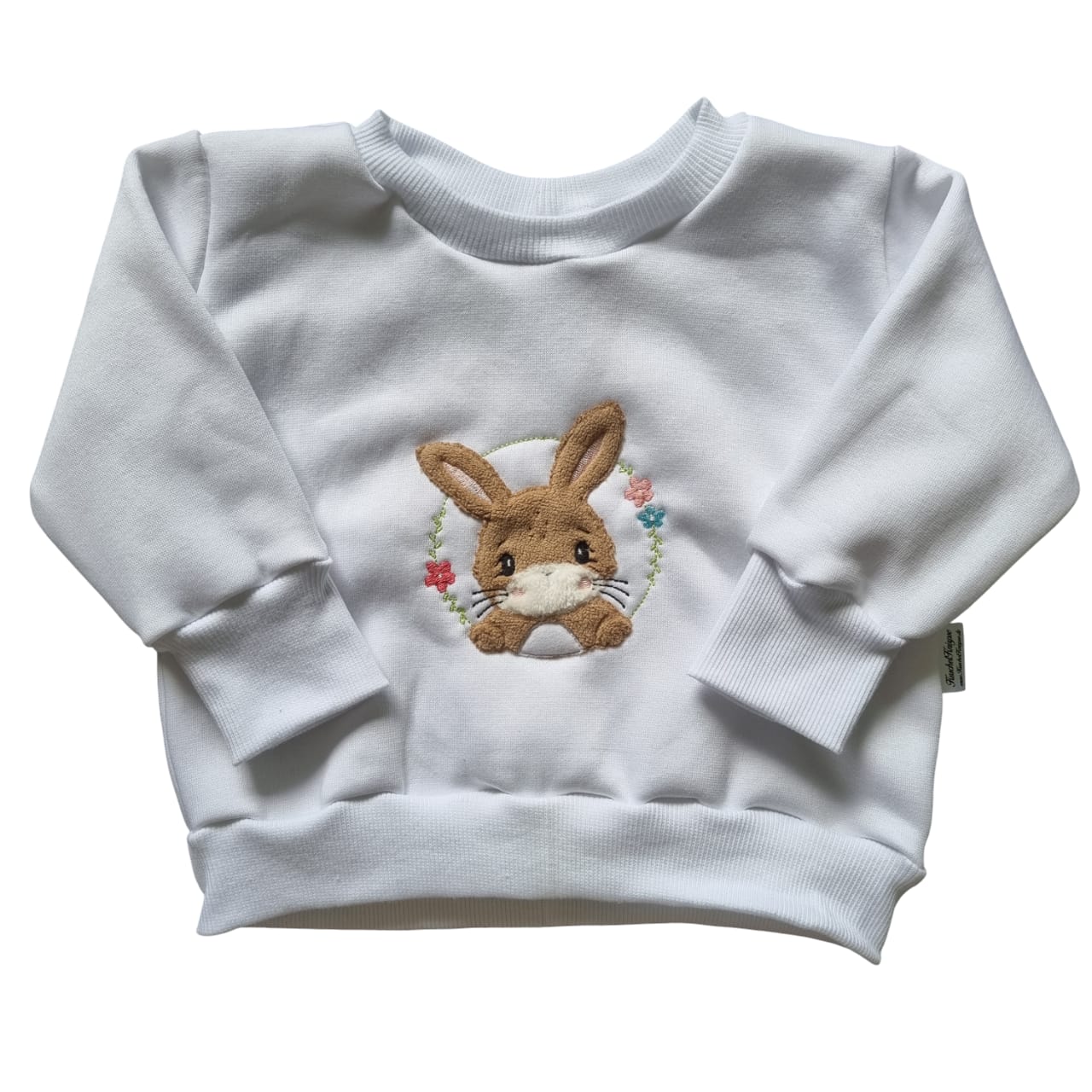 Handgemachter Pullover in Weiß mit niedlicher Hasenstickerei. Mit Bündchen für sicheren Halt und angenehmen Tragekomfort.